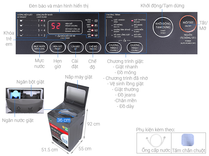 Chương trình: Đồ mỏng, Đồ Jeans, Đồ dày, Vệ sinh lồng giặt, Giặt thường, Giặt nhanh, Ghi nhớ chương trình giặt, Chăn mền