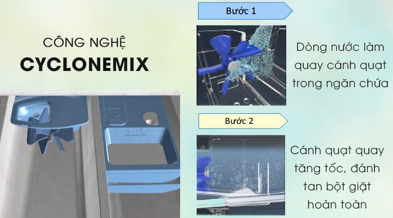 CycloneMix: Hòa tan bột giặt triệt để trước khi đưa vào lồng giặt, tránh cặn bám và tăng hiệu quả làm sạch.