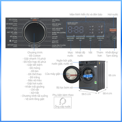 Sản phẩm này được trang bị sẵn 15 chương trình hoạt động tự động gồm: bảo vệ màu, đồ trắng, chu trình tải về, giặt 45 phút, giặt hơi nước, giặt nhanh 15 phút, giặt tiết kiệm, vắt,... Trong đó, nổi bật có thể kể đến chương trình giặt nhanh 15 phút là một giải pháp giặt sạch nhanh chóng và tiết kiệm thời gian khi bạn cần giặt quần áo mỏng ít bẩn hay bị bẩn nhẹ.