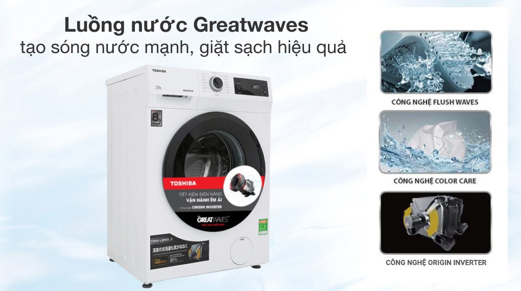 Công nghệ The GreatWaves là điểm nhấn sáng giá của máy giặt Toshiba 8.5kg. Đây là sự kết hợp giữa 3 công nghệ độc quyền: