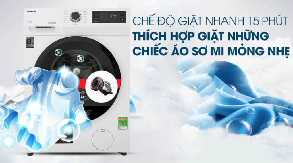 Máy giặt Toshiba inverter 8.5kg TW-BH95S2V(WK) có chế độ giặt nhanh trong 15 phút. Đây là giải pháp tuyệt vời cho những lúc bạn cần giặt gấp quần áo bẩn nhẹ mà không phải chờ đợi lâu.