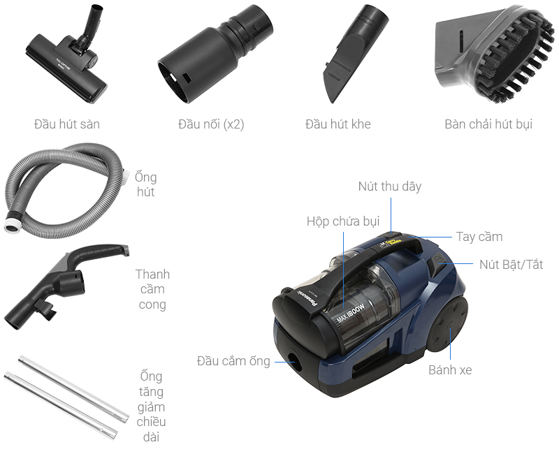 - Đầu hút bụi: Đầu hút sàn; Đầu hút khe; Đầu hút bàn chải
