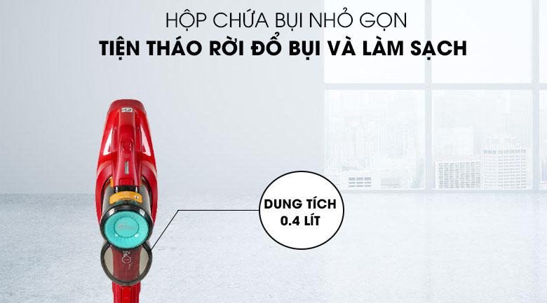 Với dung tích 0.4 lít, hộp chứa bụi trong suốt của máy giúp bạn dễ dàng quan sát lượng bụi bên trong. Thiết kế này không chỉ làm cho việc đổ bụi trở nên thuận tiện mà còn giúp bạn duy trì hiệu suất làm sạch mạnh mẽ.