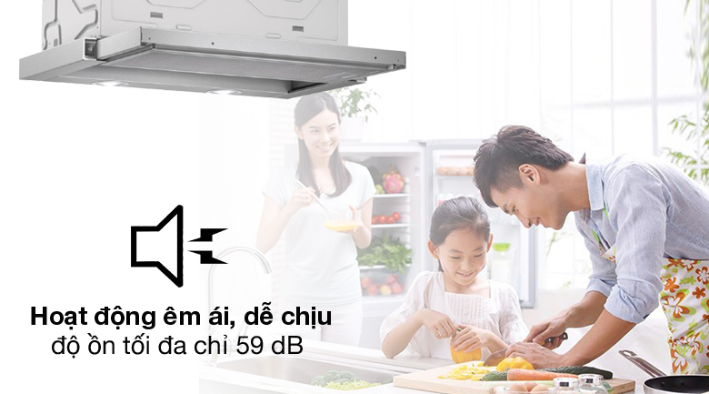 Máy hút mùi với độ ồn tối đa chỉ 59 dB, tương đương với một cuộc trò chuyện bình thường, máy không gây ảnh hưởng đến các hoạt động trong gia đình.