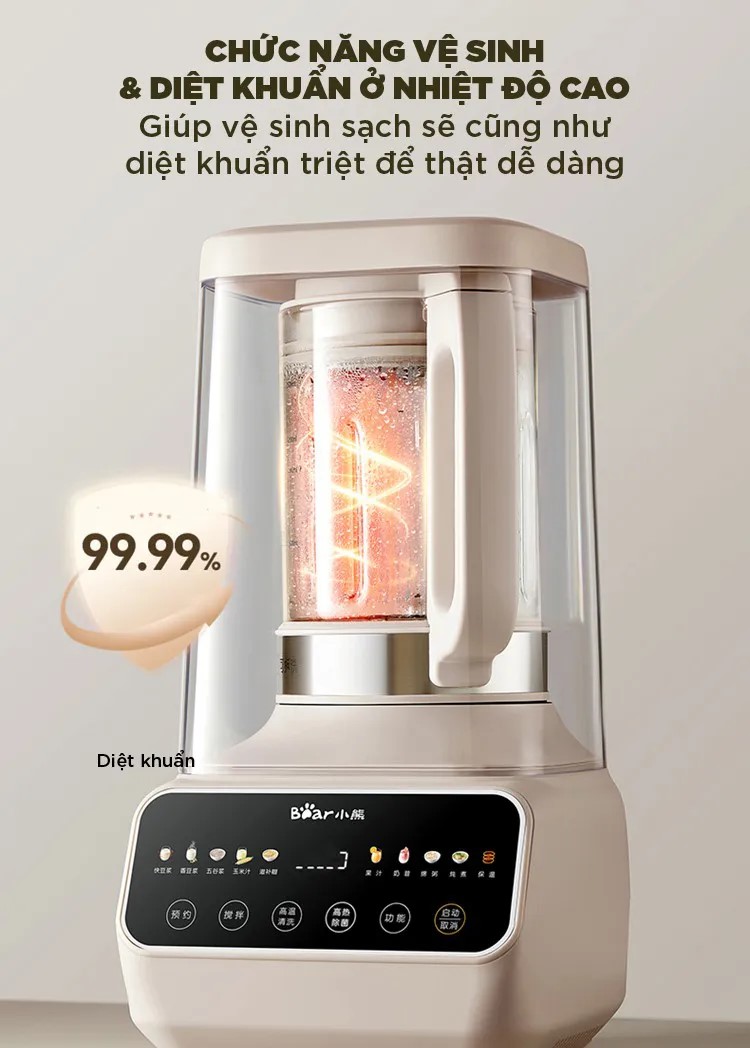 Máy Làm Sữa Hạt Đa Năng Bear PBJ-D08T1 tích hợp chế độ tự vệ sinh với nhiệt độ cao, giúp hòa tan cặn bẩn và loại bỏ vi khuẩn lên đến 99.99%. Điều này không chỉ giúp máy luôn sạch sẽ mà còn kéo dài tuổi thọ sử dụng, tiết kiệm thời gian vệ sinh thủ công.