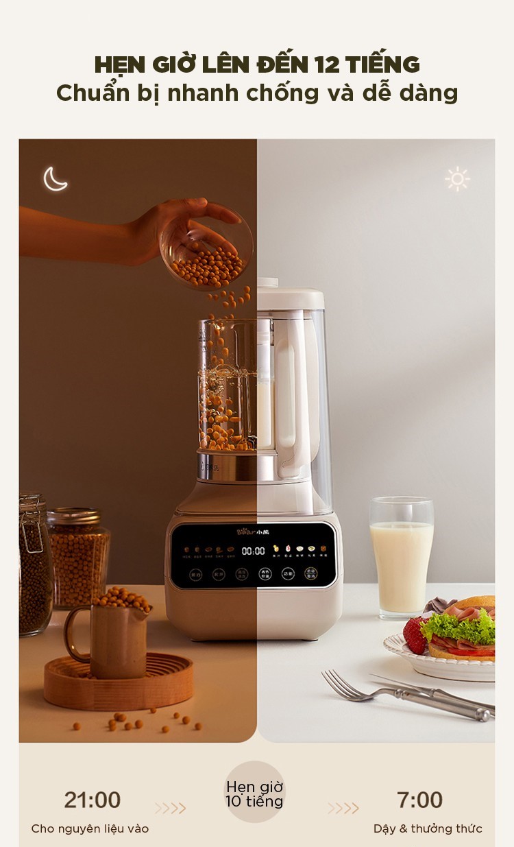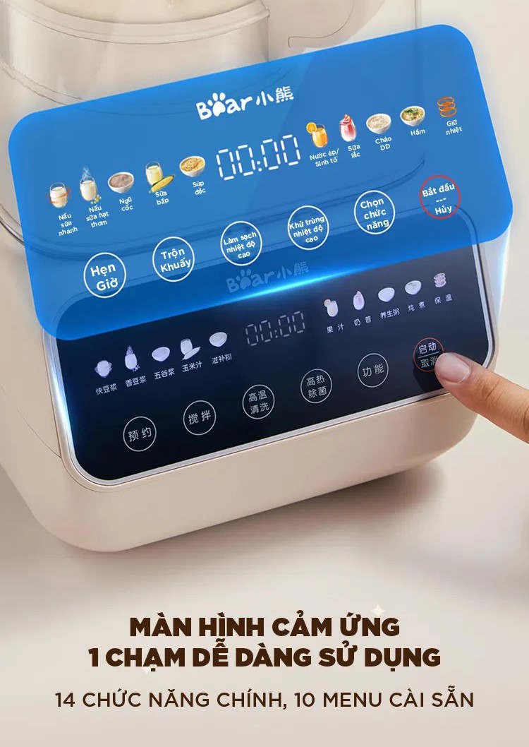 Không chỉ đơn giản là một chiếc máy nấu sữa hạt, Máy Làm Sữa Hạt Bear PBJ-D08T1 còn tích hợp 10 chức năng cài đặt sẵn như: nấu sữa hạt, làm sữa đậu nành, nấu cháo ngũ cốc, làm sữa bắp, chế biến sinh tố, chè, hầm, giữ ấm,... Tất cả đều được điều chỉnh dễ dàng qua màn hình cảm ứng hiện đại.