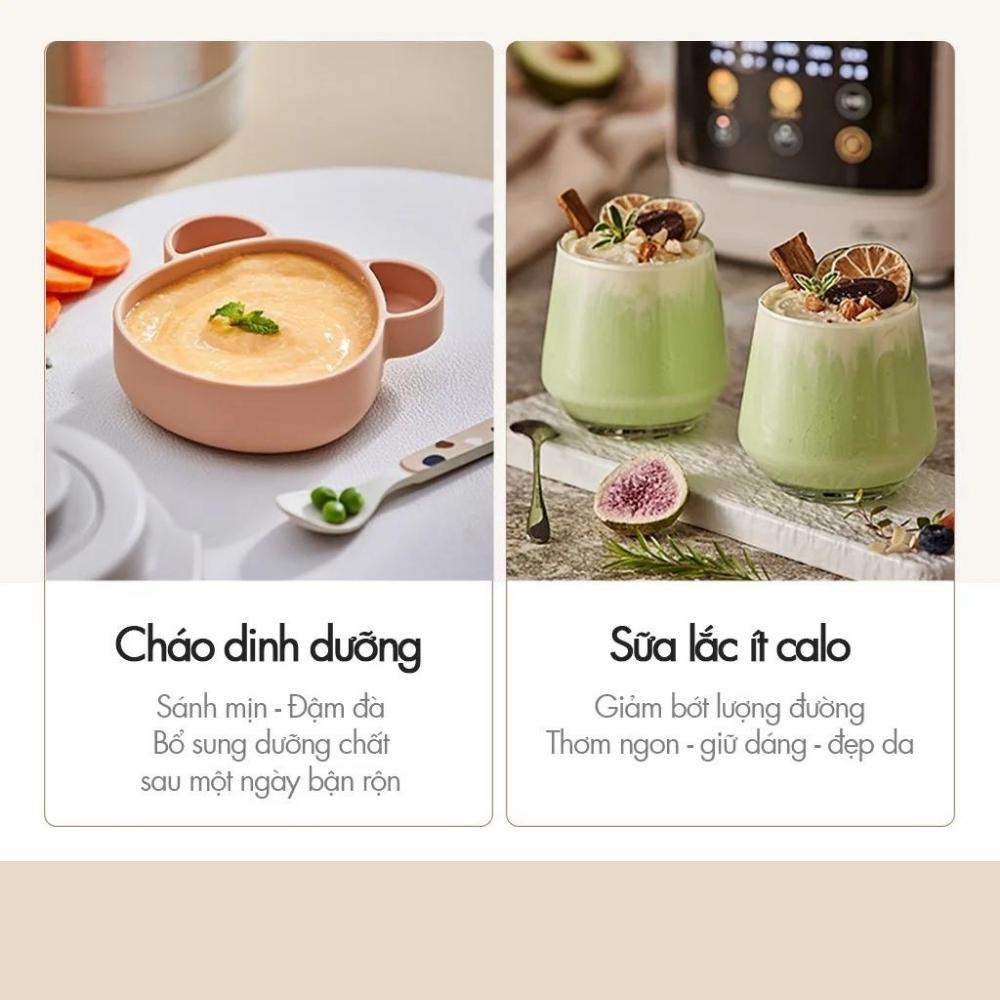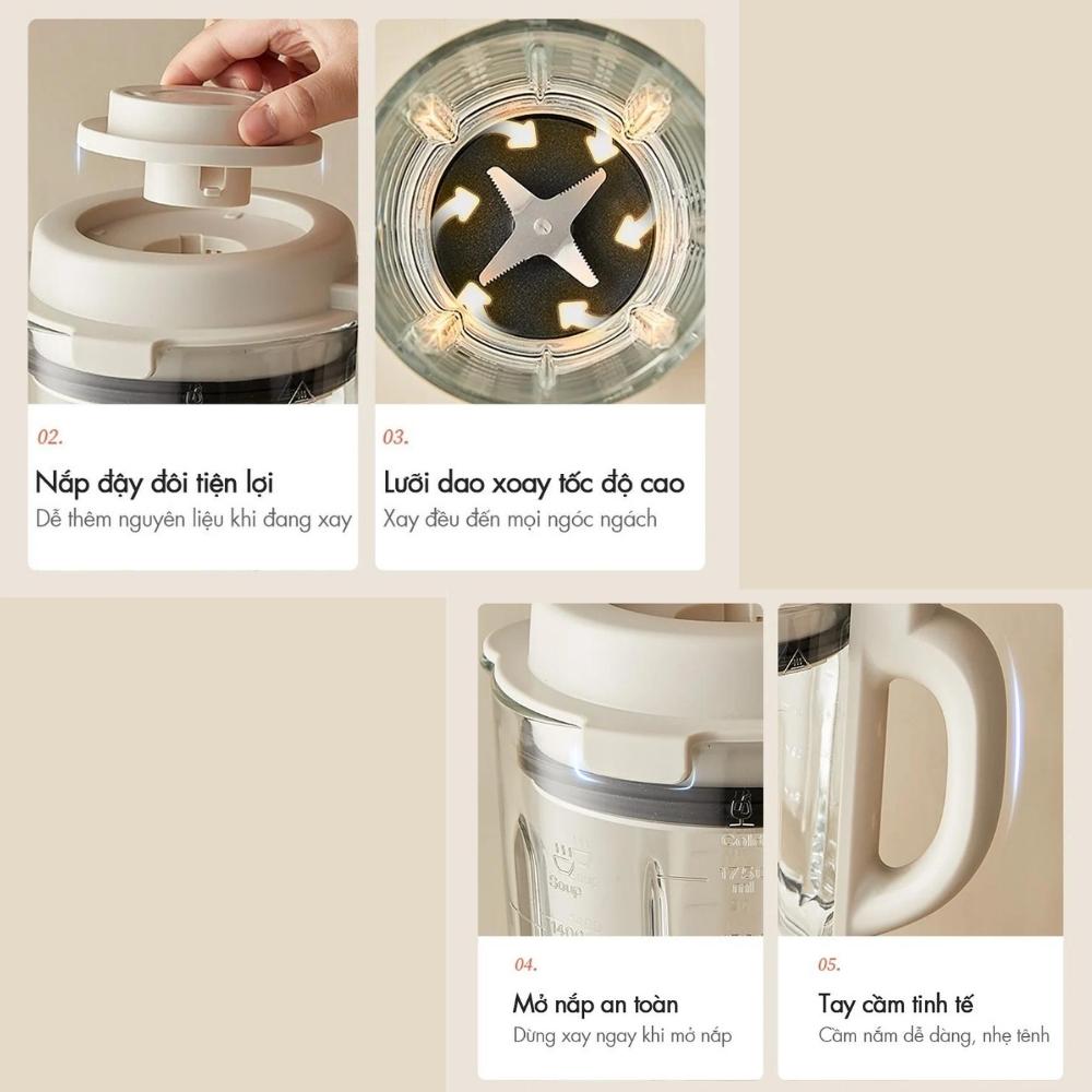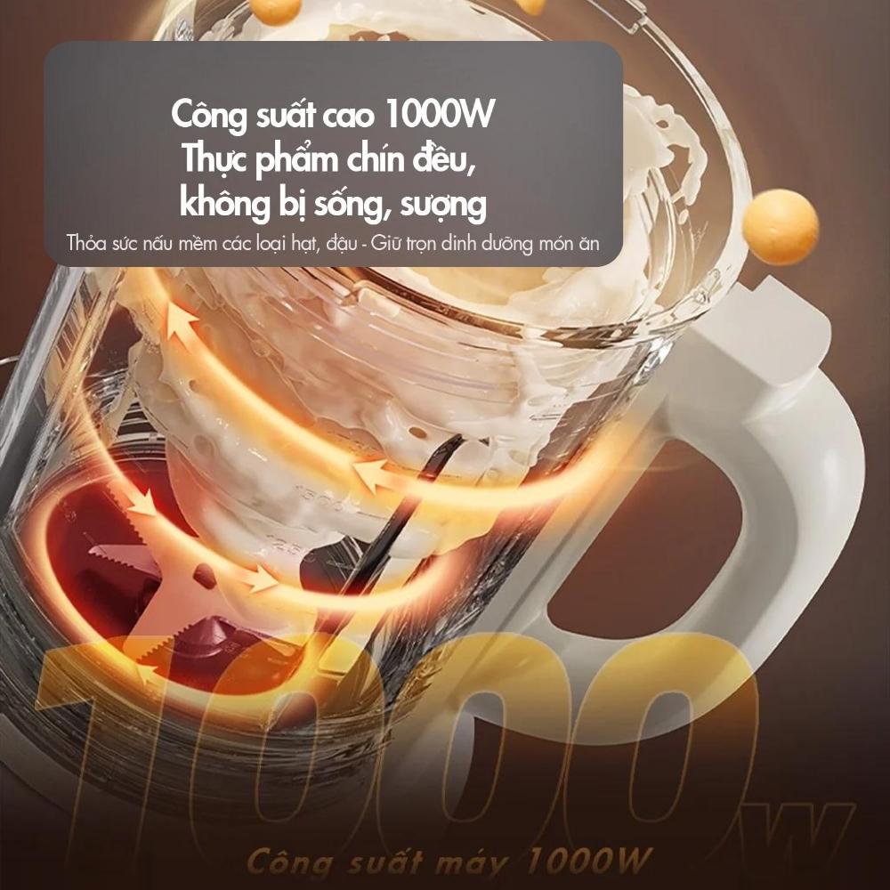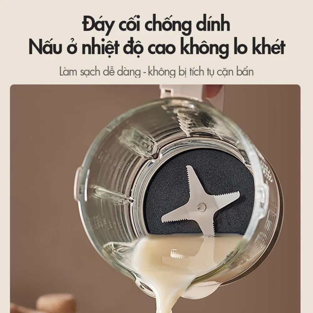 - Công suất máy làm sữa hạt lên đến 1000W, đáy cối chống dính không lo khét