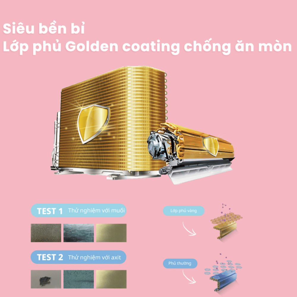 Lớp phủ Golden Coating chống ăn mòn trên dàn nóng và dàn lạnh giúp ngăn chặn vi khuẩn, bảo vệ máy khỏi các tác nhân gây hại như muối, axit.