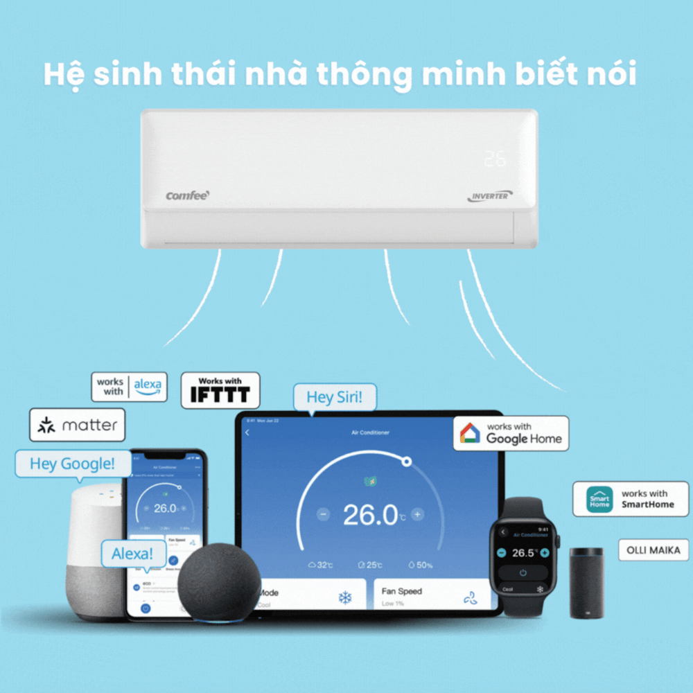 Máy lạnh Comfee Inverter 1.5HP CFS-13VGD hỗ trợ kết nối với các thiết bị trong hệ sinh thái nhà thông minh như Google Assistant, Apple Homekit, Maika Assistant, cho phép bạn điều khiển bằng giọng nói tiếng Việt dễ dàng. Ngoài ra, sản phẩm còn hỗ trợ chia sẻ thiết bị để nhiều người dùng trong gia đình cùng kiểm soát tiện lợi.