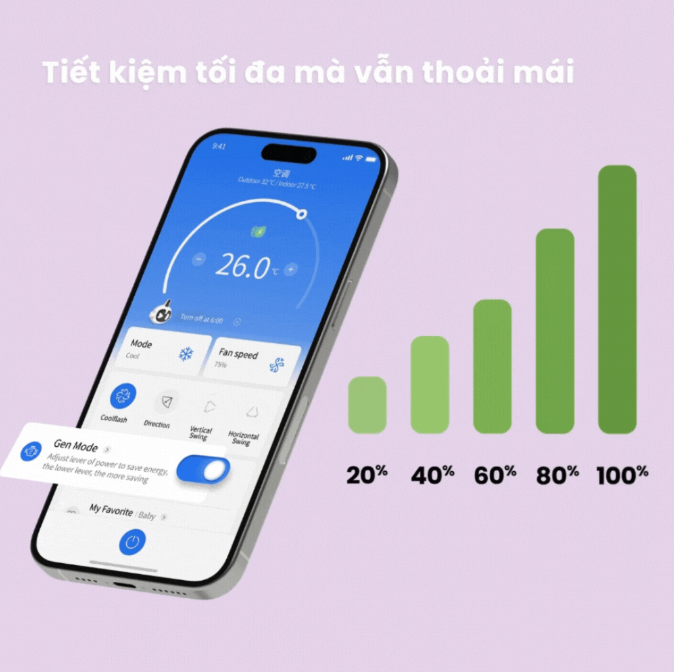 GEAR+ mode: Chế độ này cho phép bạn tùy chỉnh mức công suất hoạt động của máy lạnh với 5 cấp độ (20%, 40%, 60%, 80%, 100%) thay vì 3 cấp độ như trước. Khi cảm thấy đủ mát, bạn có thể chọn mức công suất thấp hơn để giảm tiêu thụ điện năng mà vẫn duy trì được sự thoải mái.