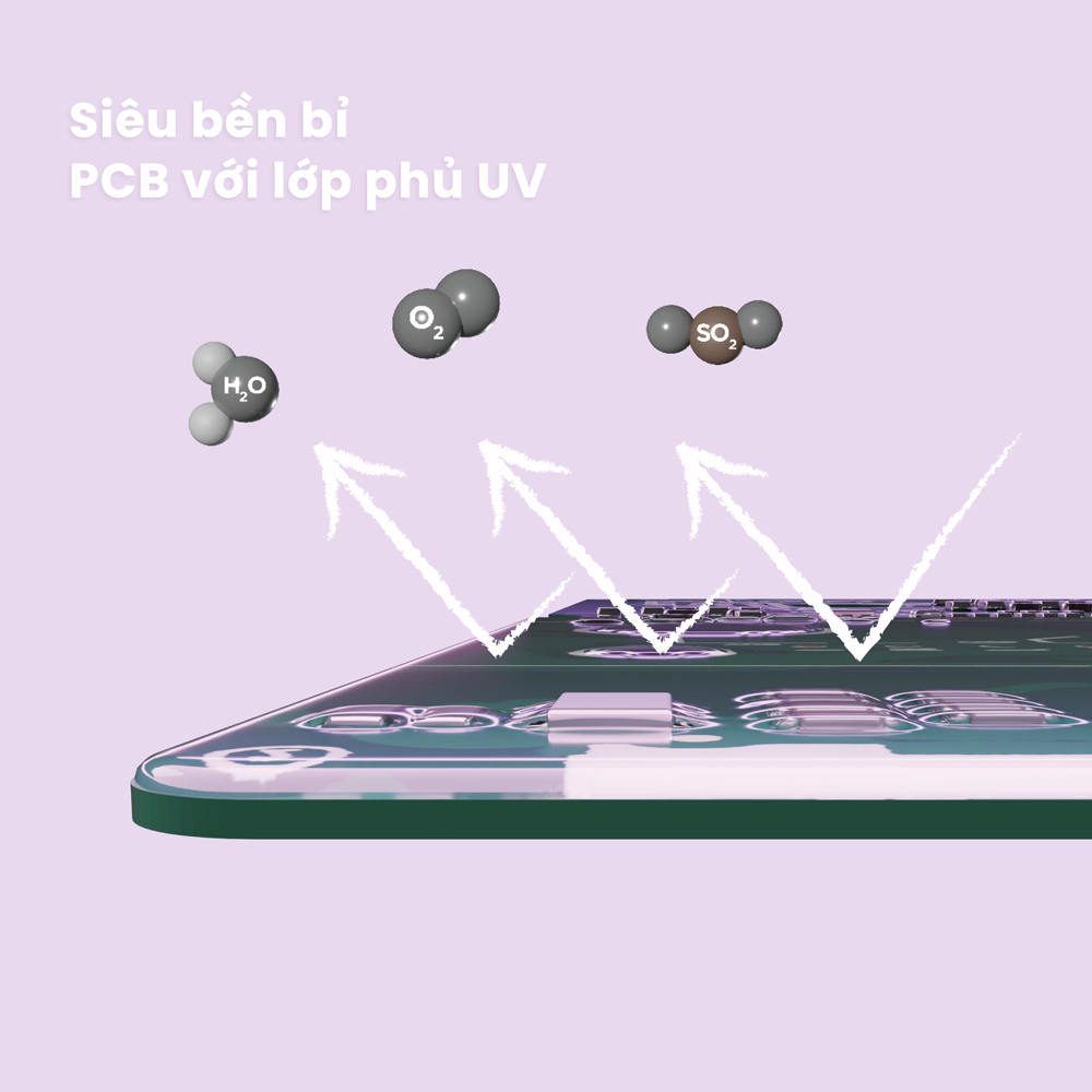 PCB với lớp phủ UV: Lớp phủ UV dày gấp đôi giúp bảo vệ các linh kiện trên PCB khỏi sự oxy hóa do độ ẩm, tăng độ bền cho máy.