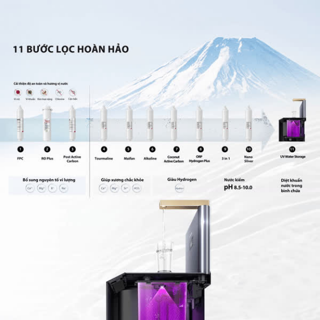 Các lõi chức năng như Post Carbon, Tourmaline, Maifan, Alkaline và Hydrogen Plus hỗ trợ bổ sung khoáng chất, cải thiện vị nước và tăng giá trị sử dụng.