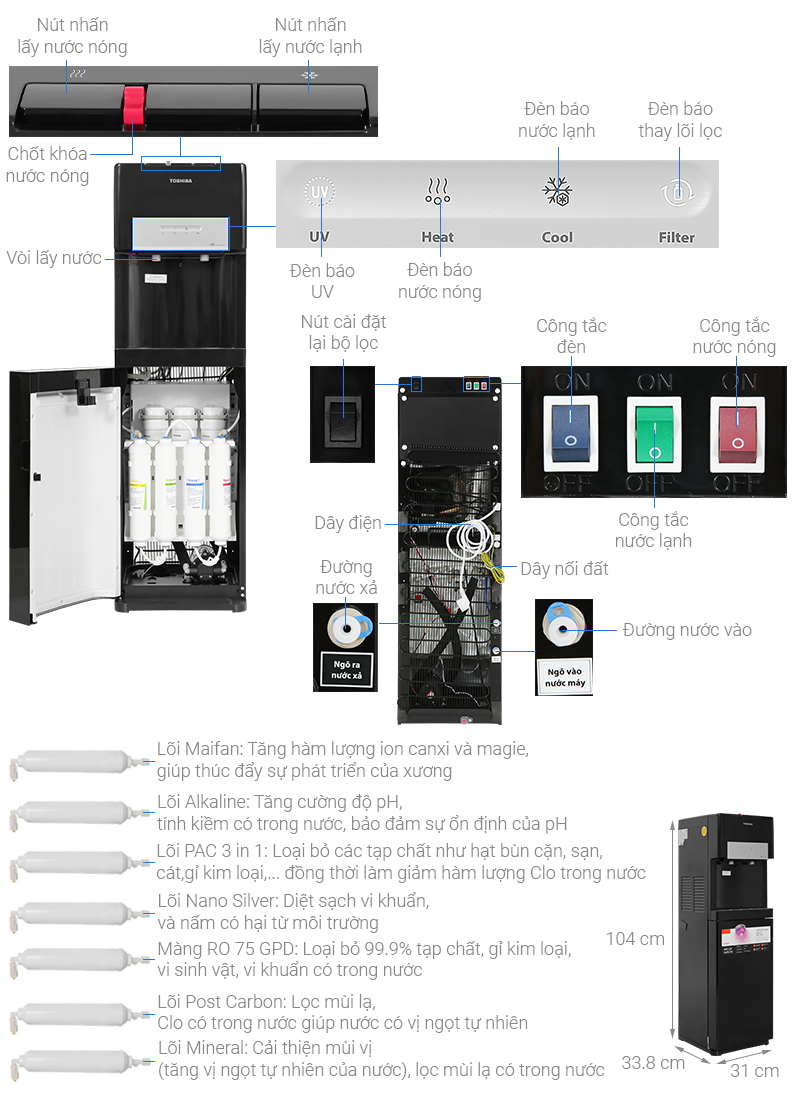 Tiện ích: Khóa vòi nóng, báo thay lõi, UV diệt khuẩn, đèn ban đêm, chế độ Eco