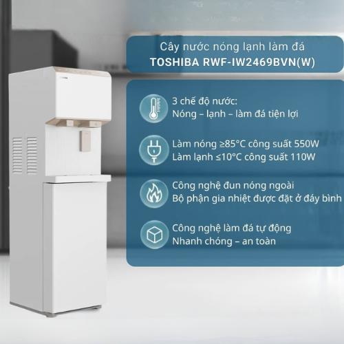 Máy nước nóng lạnh làm đá Toshiba RWF-IW2469BVN(W) là lựa chọn sáng giá cho người dùng mong muốn một thiết bị đa chức năng, tiện nghi và bền bỉ: