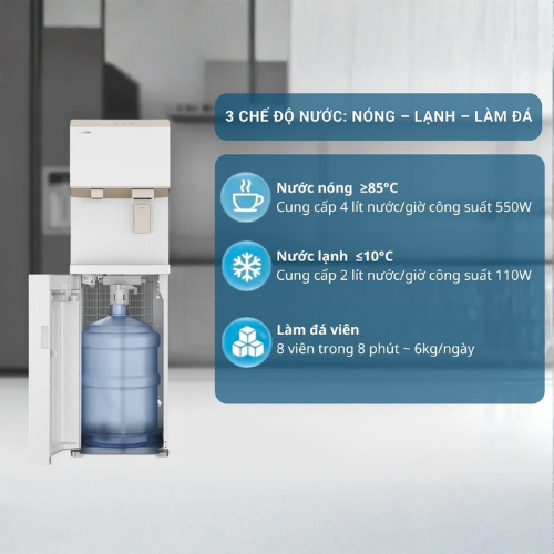 Tại phòng bếp hoặc phòng khách, model này giúp mang lại trải nghiệm tiện nghi: nước nóng sẵn, nước lạnh mát và đá tự động phục vụ nhu cầu uống nước, nấu nướng và tiếp khách.