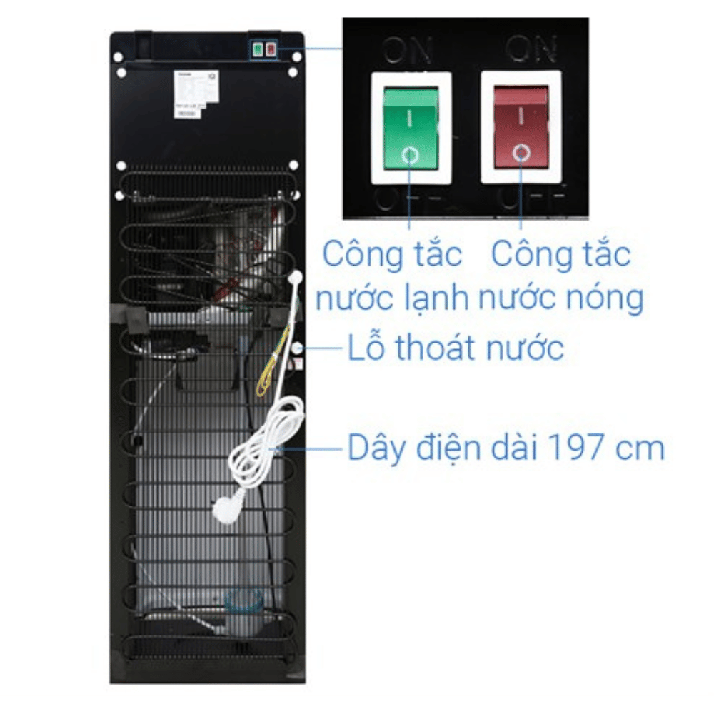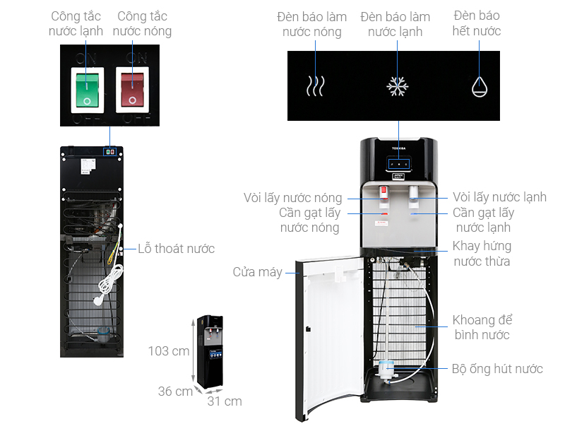 Tiện ích: Thiết kế bình âm trong tủ, công nghệ Ice Cold, khay hứng nước lớn, đèn báo nóng lạnh và báo hết nước