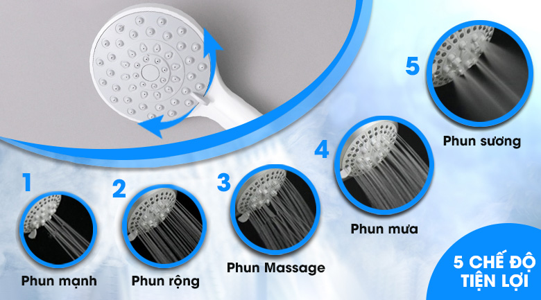 Máy được đi kèm vòi sen 5 chế độ phun: phun mạnh, phun rộng, phun massage, phun dạng mưa và phun sương. Mỗi chế độ đều mang đến trải nghiệm thư giãn, phù hợp với từng nhu cầu cá nhân trong gia đình.
