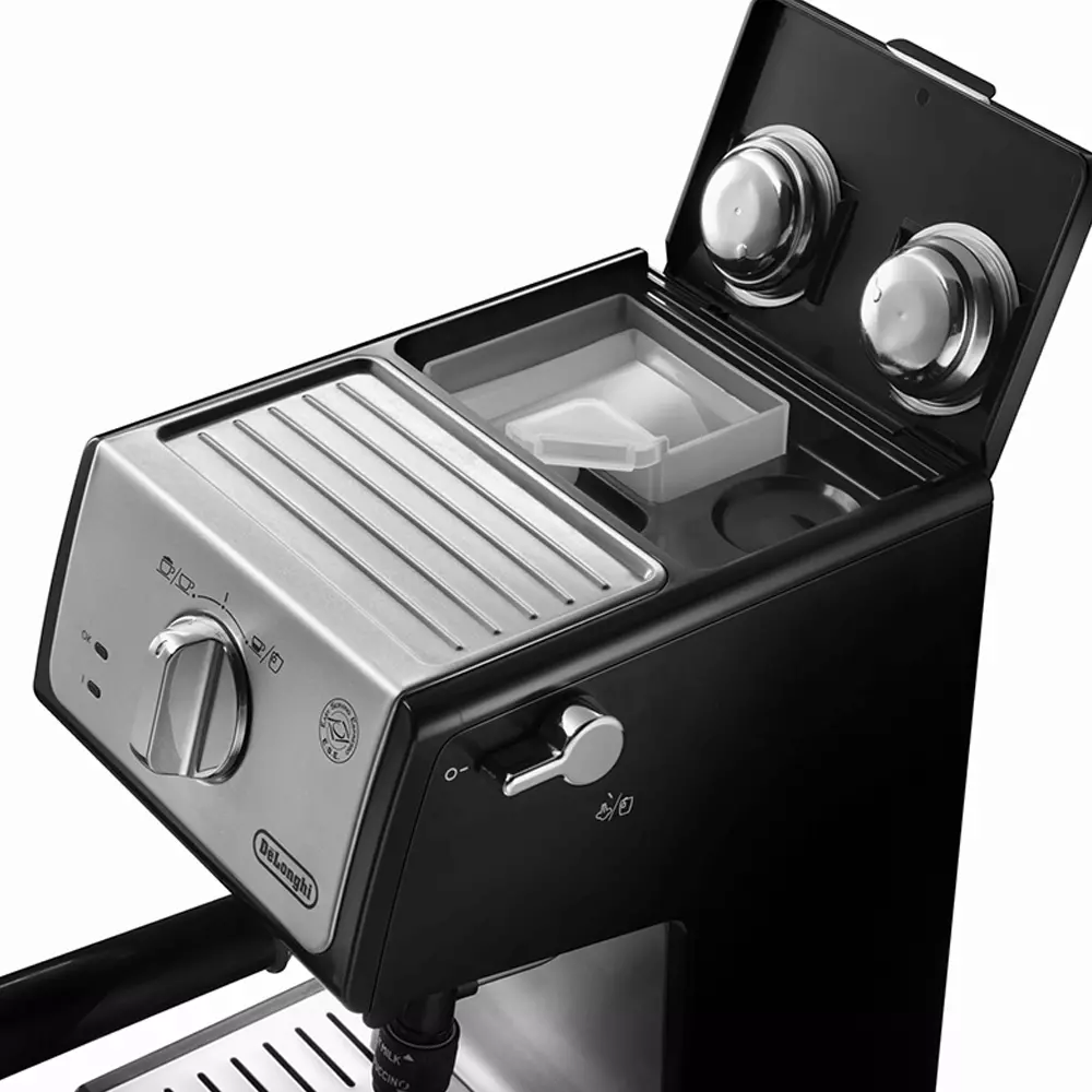 Máy pha cafe Delonghi còn được trang bị khay hứng nước nhỏ giọt có thể tháo rời, cho phép sử dụng ly hoặc tách cao đến 13cm.