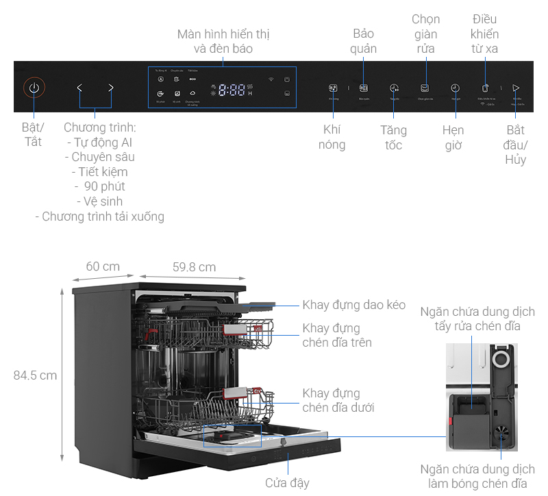 Kích thước máy là Cao 84.5cm - Ngang 59.8cm - Sâu 60cm, nặng 48.4kg, với vỏ và cửa máy đều làm từ thép không gỉ, mang lại độ bền cao và dễ dàng vệ sinh. Bảng điều khiển cảm ứng ẩn kết hợp cùng màn hình LED và đèn báo hiển thị trực quan, hiện đại.