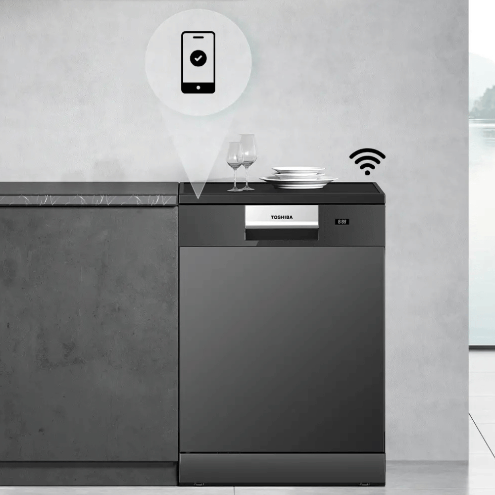 Với khả năng kết nối wifi và điều khiển từ xa qua ứng dụng SmartHome, người dùng có thể theo dõi, vận hành, điều chỉnh các chương trình rửa mọi lúc, mọi nơi. Máy rửa chén độc lập Toshiba còn có thể phân tích độ bẩn nước nhờ AI, tự động điều chỉnh lượng nước và thời gian phù hợp, đồng thời hiển thị báo cáo điện năng và lượng nước tiêu thụ.
