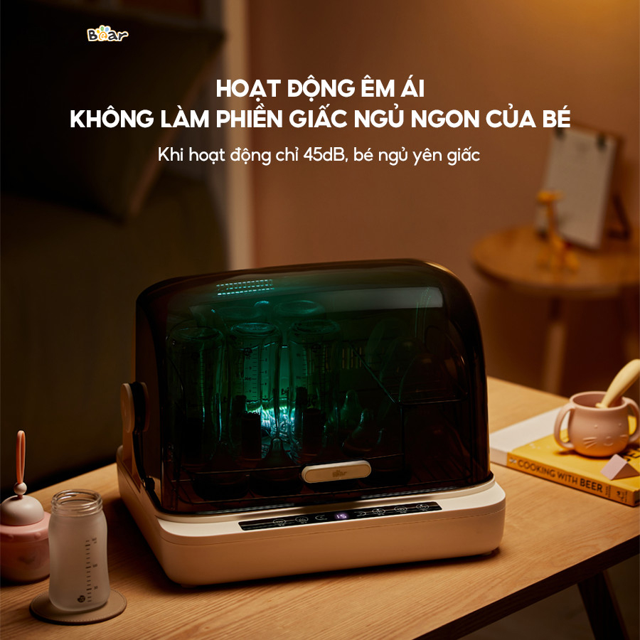 Hoạt động với độ ồn chỉ 45dB, Máy Sấy Tiệt Trùng Bình Sữa Bear SB-MTT20 vận hành vô cùng êm ái, không gây tiếng động lớn. Nhờ đó, mẹ có thể sử dụng máy vào ban đêm mà không làm ảnh hưởng đến giấc ngủ của bé.