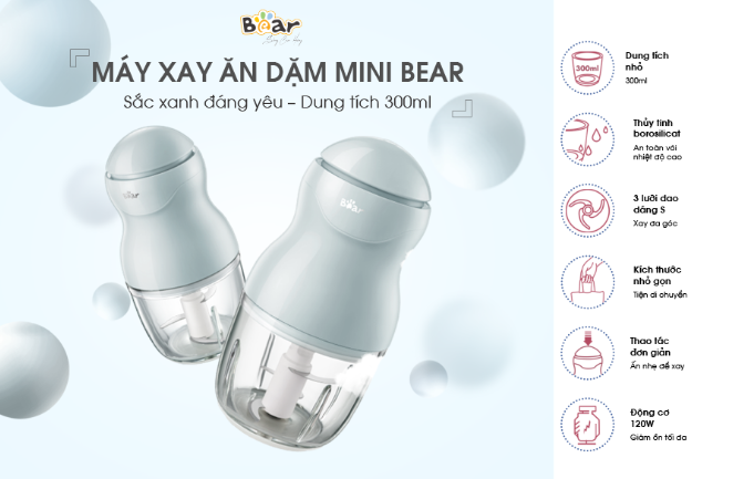 Với dung tích 300ml và thiết kế nhỏ gọn, máy xay này là sự lựa chọn tuyệt vời cho việc xay nhuyễn thực phẩm dành cho bé một cách linh hoạt và tiện lợi.