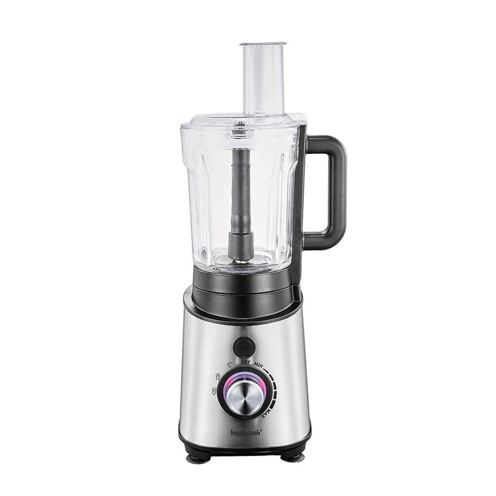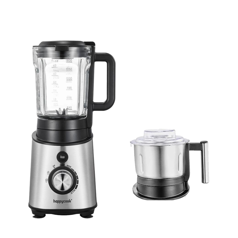 Máy xay sinh tố đa năng Happy Cook HBM-T150B với thiết kế 2 cối xay cứng cáp. Cối xay lớn bằng thủy tinh với dung tích 1,5L, cối xay inox nhỏ dung tích 500gam kết hợp lưỡi dao sắc bén có chức năng hỗ trợ xay đá viên, xay sinh tố, rau củ quả, bào sợi nhỏ và cắt lát cho dưa leo, cà rốt, khoai tây hay xay khô: tiêu, cà phê, mè...