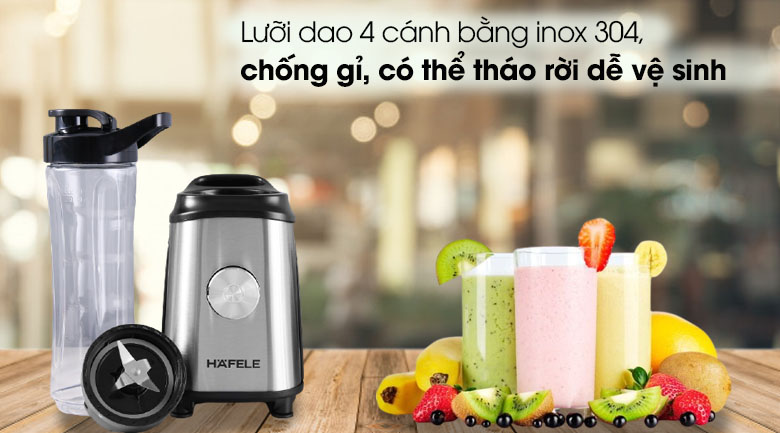 Máy xay sinh tố mini Hafele GS-621/ 535.43.263 xay nhuyễn trái cây bằng lưỡi dao 4 cánh được làm từ inox 304 chống gỉ. Máy hoạt động với công suất 350W xay nhuyễn nhanh chóng.