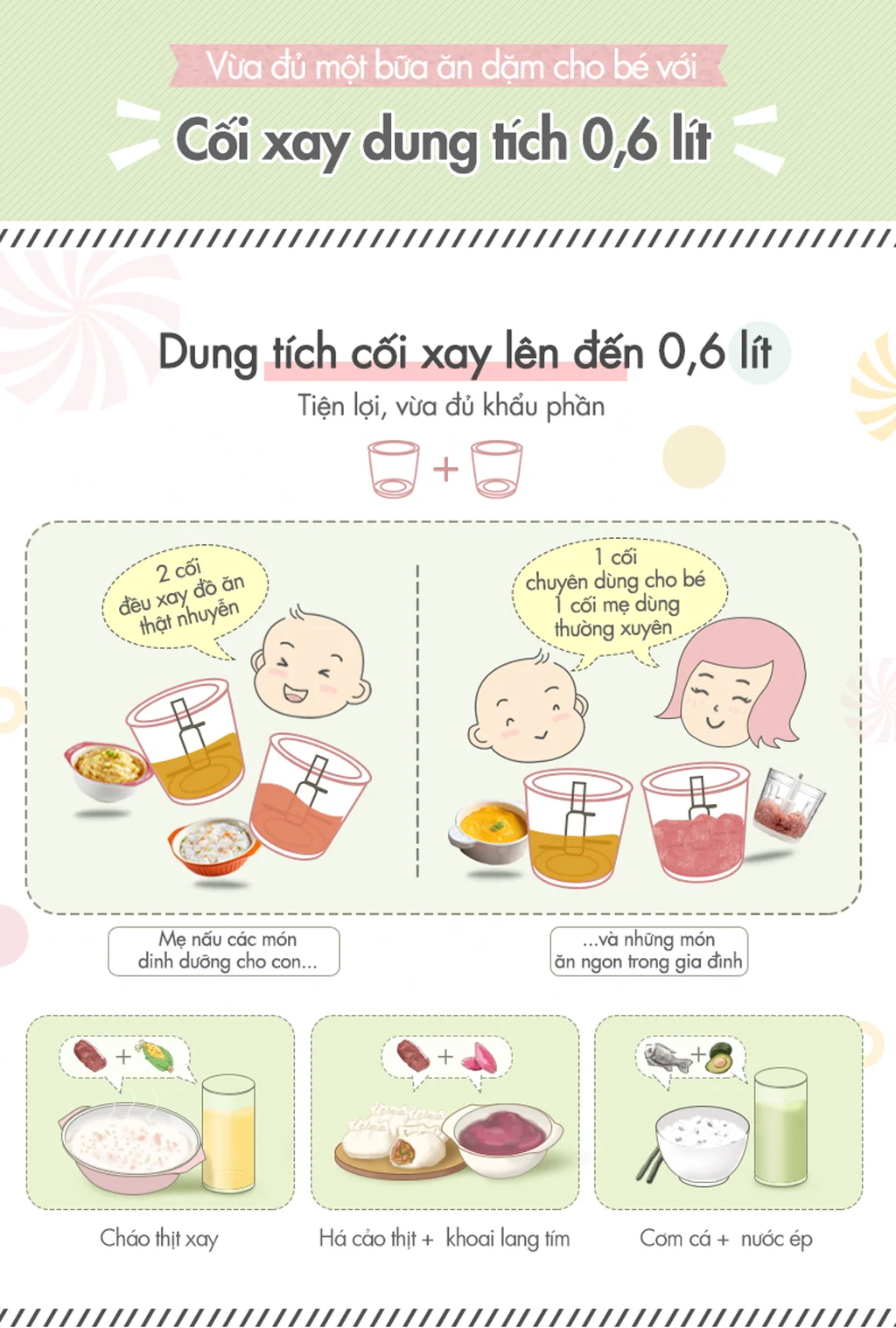 Thiết kế khoang chứa thực phẩm với dung tích 600ml đủ lớn cho các bữa ăn của trẻ nhỏ hoặc người lớn tuổi trong gia đình. Đặc biệt, phần khoang chứa được làm từ thủy tinh dày 6mm, đảm bảo an toàn tuyệt đối cho người sử dụng.