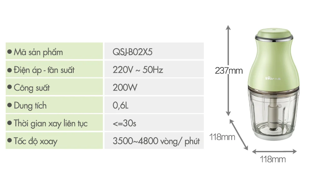 - Máy xay đa năng Bear có công suất 200W, dung tích 0.6L
