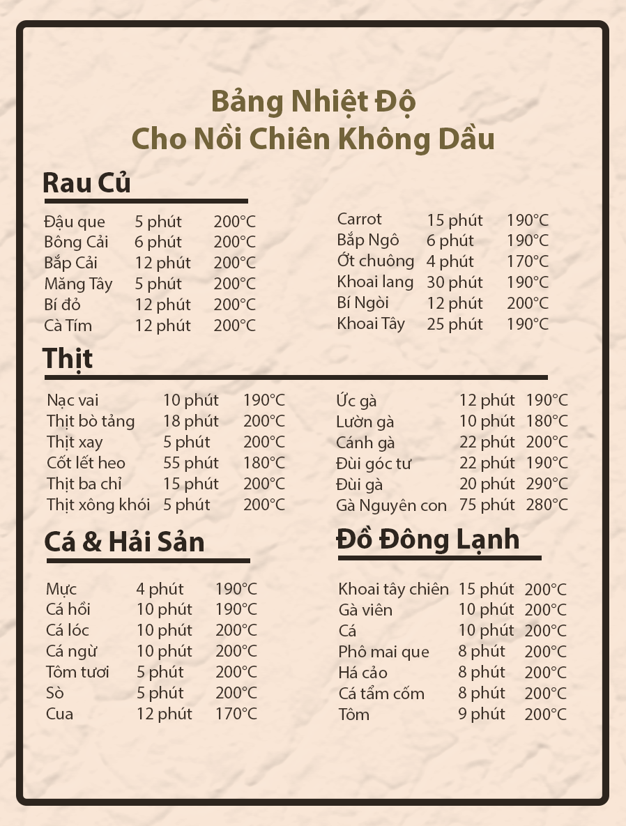 Sau đây là bảng nhiệt độ đầy đủ nhất cho từng loại thực phẩm khi sử dụng nồi chiên không dầu: