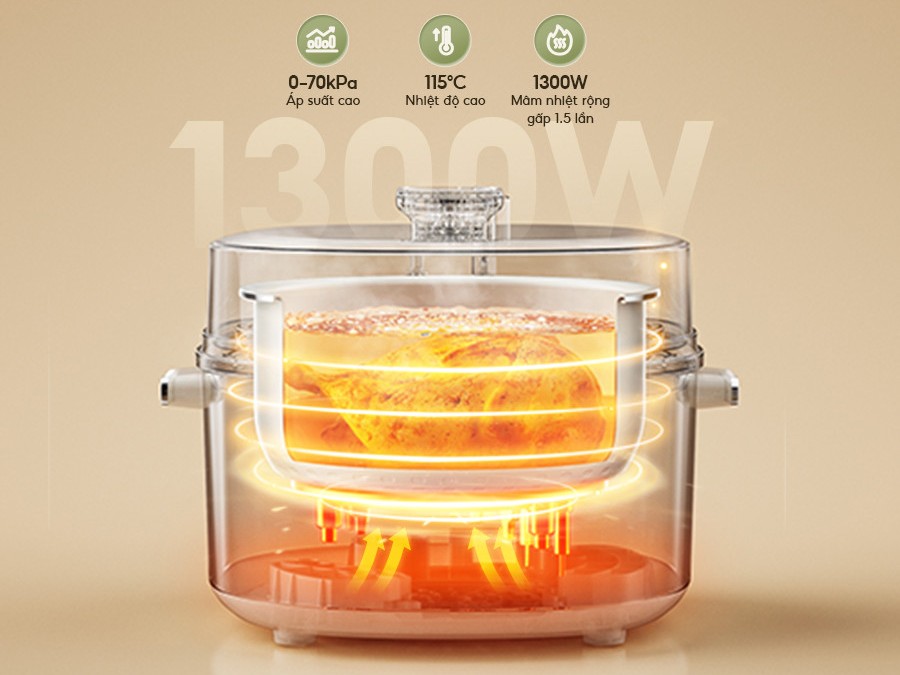 Nồi áp suất Bear 4L SB AS40W hoạt động với công suất 1300W, giúp rút ngắn thời gian nấu nướng nhưng vẫn đảm bảo thực phẩm chín đều, thơm ngon. Nhiệt lượng phân bổ đồng đều nhờ mâm nhiệt rộng hơn 1,3 lần so với phiên bản cũ, đảm bảo món ăn được làm chín từ trong ra ngoài.