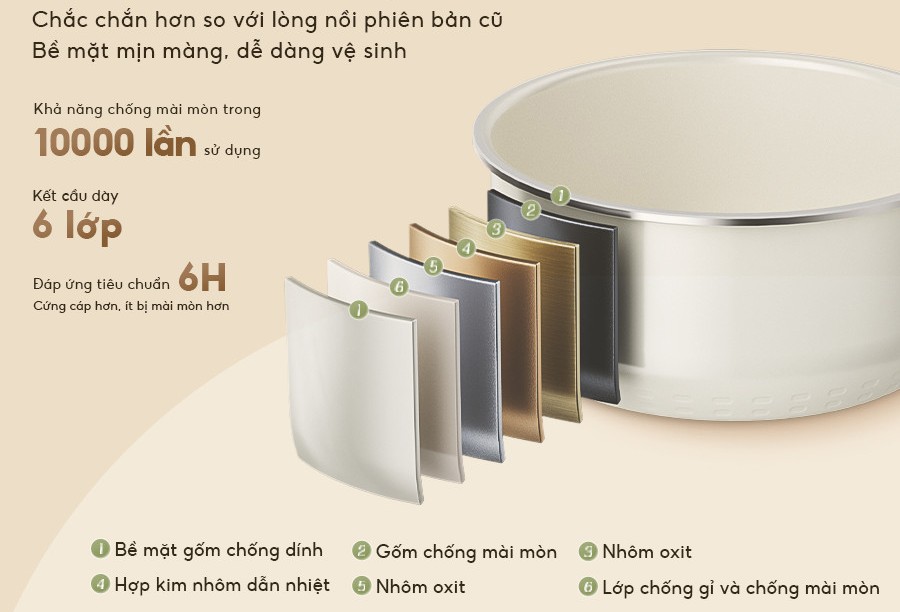Lòng nồi được cấu tạo 6 lớp dày dặn: bề mặt gốm chống dính, gốm chống mài mòn, 2 lớp nhôm oxit, hợp kim nhôm dẫn nhiệt và lớp chống gỉ. Nhờ đó, nồi giữ nhiệt tốt, truyền nhiệt đều, bền bỉ và dễ dàng vệ sinh sau sử dụng.