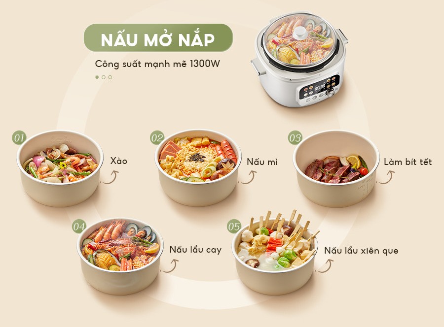 Nồi áp suất Bear SB-AS40W tích hợp 11 chức năng nấu đa dạng: hầm thịt, nấu súp, xào, nấu lẩu, nấu xôi, nấu cháo, nấu nhanh, nướng không nước, hẹn giờ, giữ ấm và thêm gia vị trong quá trình nấu. Đặc biệt, nồi cho phép nấu mở nắp như một nồi thường, giúp người dùng linh hoạt trong chế biến. Nhờ đó, chỉ với một chiếc nồi, bạn có thể chuẩn bị hầu hết các món ăn cho cả gia đình.