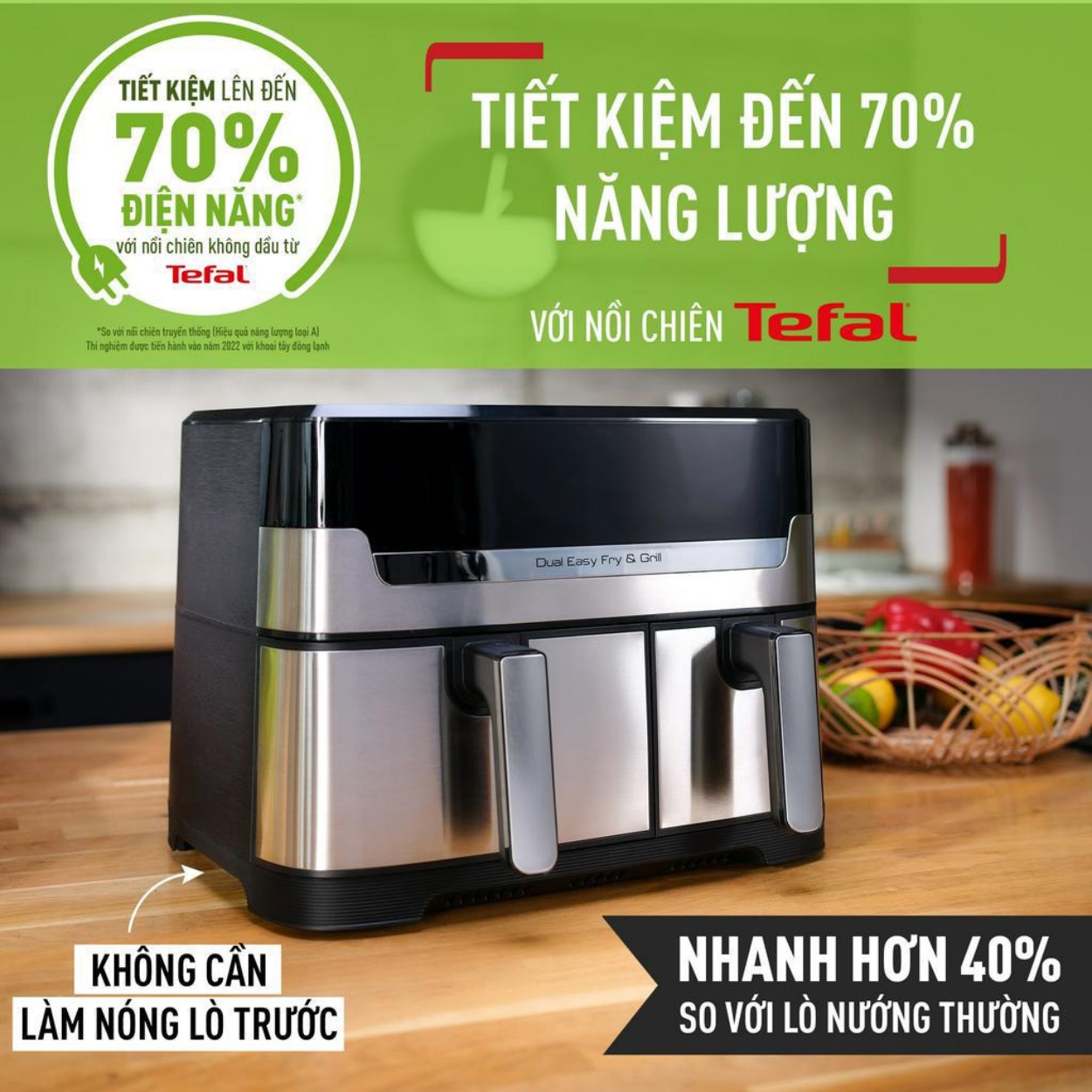 Nồi chiên không dầu 2 ngăn Tefal EY905D10 tiết kiệm năng lượng hơn tới 70% và nấu nhanh hơn tới 40% so với lò nướng truyền thống. Điều này không chỉ giúp bạn tiết kiệm chi phí điện năng mà còn giúp bạn chế biến món ăn nhanh chóng và tiện lợi hơn. Với Tefal EY905D10, việc nấu nướng trở nên dễ dàng và hiệu quả, đáp ứng mọi nhu cầu ẩm thực của gia đình bạn.