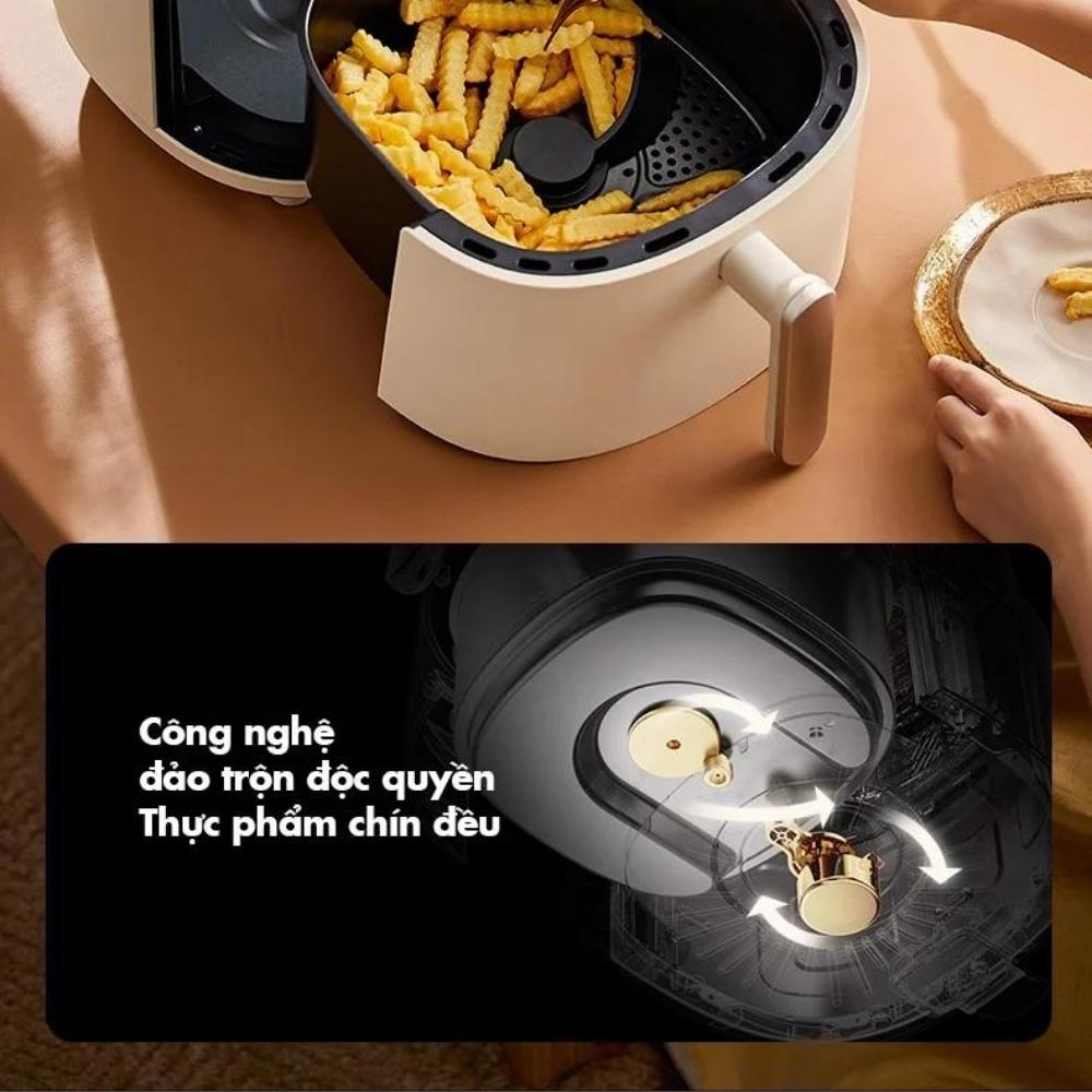 Thiết kế quạt đảo thực phẩm xoay đều giúp thực phẩm chiên nướng chín giòn toàn diện.