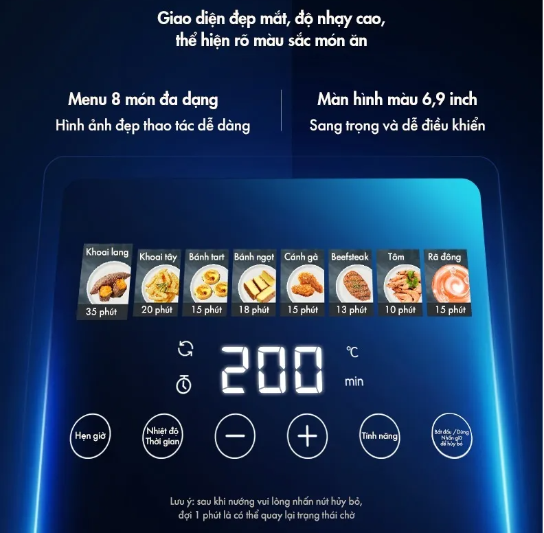 Bảng điều khiển cảm ứng dễ dàng điều chỉnh mức nhiệt và chọn từ menu 8 món đa dạng. Màn hình màu 6,9 inch sang trọng và tiếng Việt dễ dàng điều khiển.
