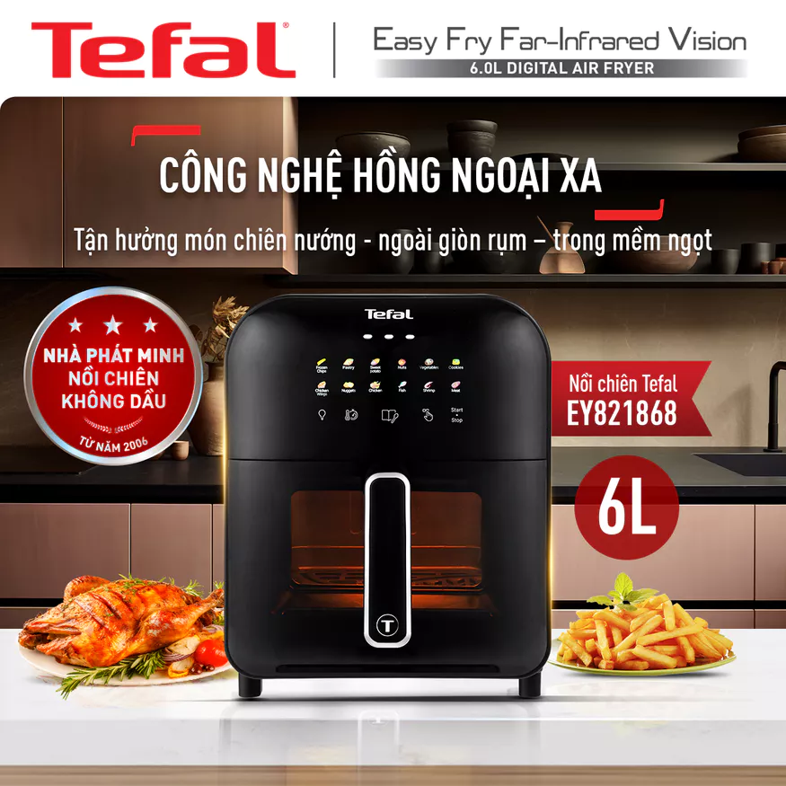 Nồi chiên không dầu Tefal 6L EY821868 là lựa chọn hoàn hảo cho những ai yêu thích món ăn chiên giòn nhưng vẫn muốn duy trì lối sống lành mạnh. Với thiết kế sang trọng, tông màu đen hiện đại cùng công nghệ nấu tiên tiến, sản phẩm không chỉ làm đẹp gian bếp mà còn giúp bạn chế biến bữa ăn nhanh chóng, ít dầu mỡ và thơm ngon trọn vị. Đây chính là trợ thủ đắc lực không thể thiếu trong căn bếp gia đình từ 4-6 thành viên.