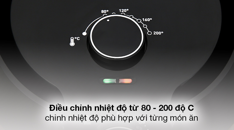 Cũng giống như điều chỉnh thời gian, nồi chiên không dầu trang bị núm xoay nhiệt độ từ 80 - 200 độ C, bạn có thể dễ dàng kết hợp nhiệt độ và thời gian nấu để có được món ăn ngon có độ giòn như mong muốn.