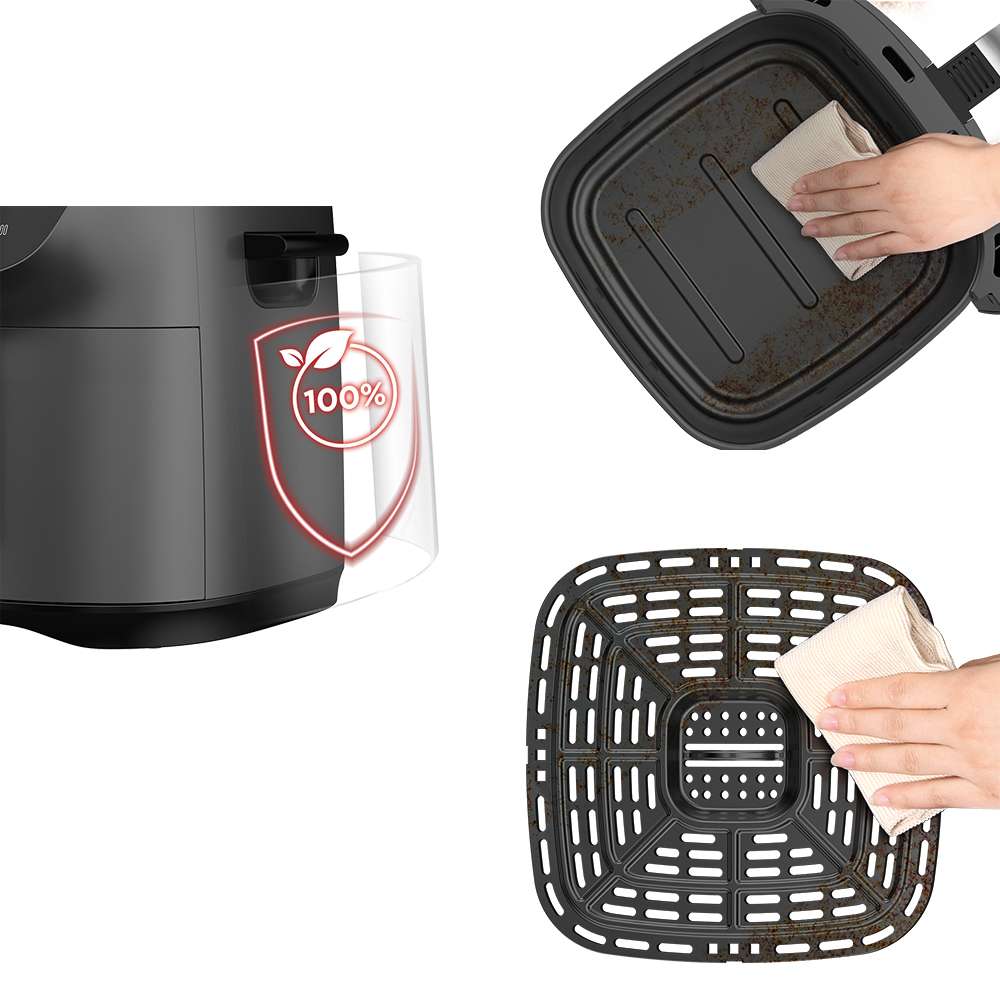 Toàn bộ bộ phận tiếp xúc thực phẩm đều được làm từ vật liệu cao cấp, chịu nhiệt tới 220°C và phủ chống dính. Lòng nồi và vỉ chiên dễ vệ sinh, không lo bám dính thực phẩm hay ám mùi.