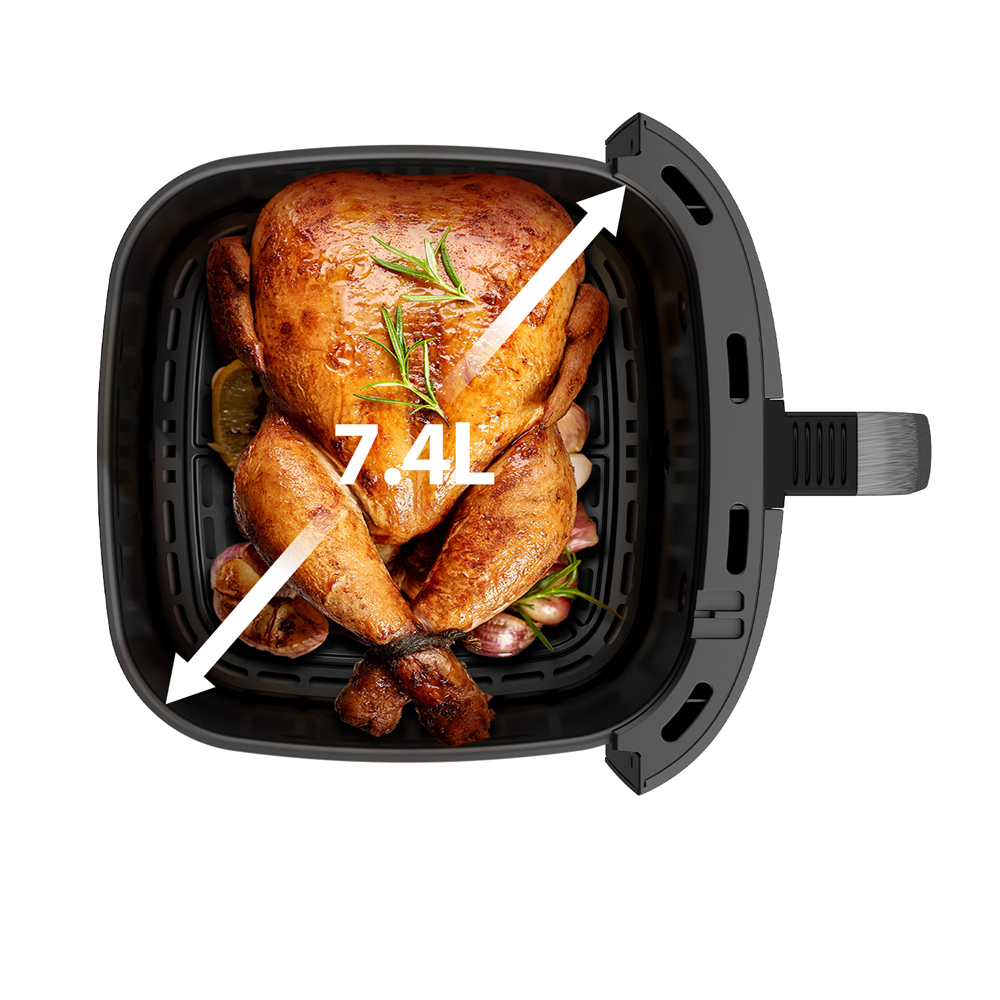 Thiết kế vuông vắn thông minh không chỉ tăng sức chứa mà còn giúp luồng khí nóng lưu thông tối ưu hơn. Dung tích 7.4L cho phép chế biến lượng thực phẩm lớn mà không cần chia nhỏ, vô cùng tiện lợi cho gia đình đông người hay tiệc tùng.