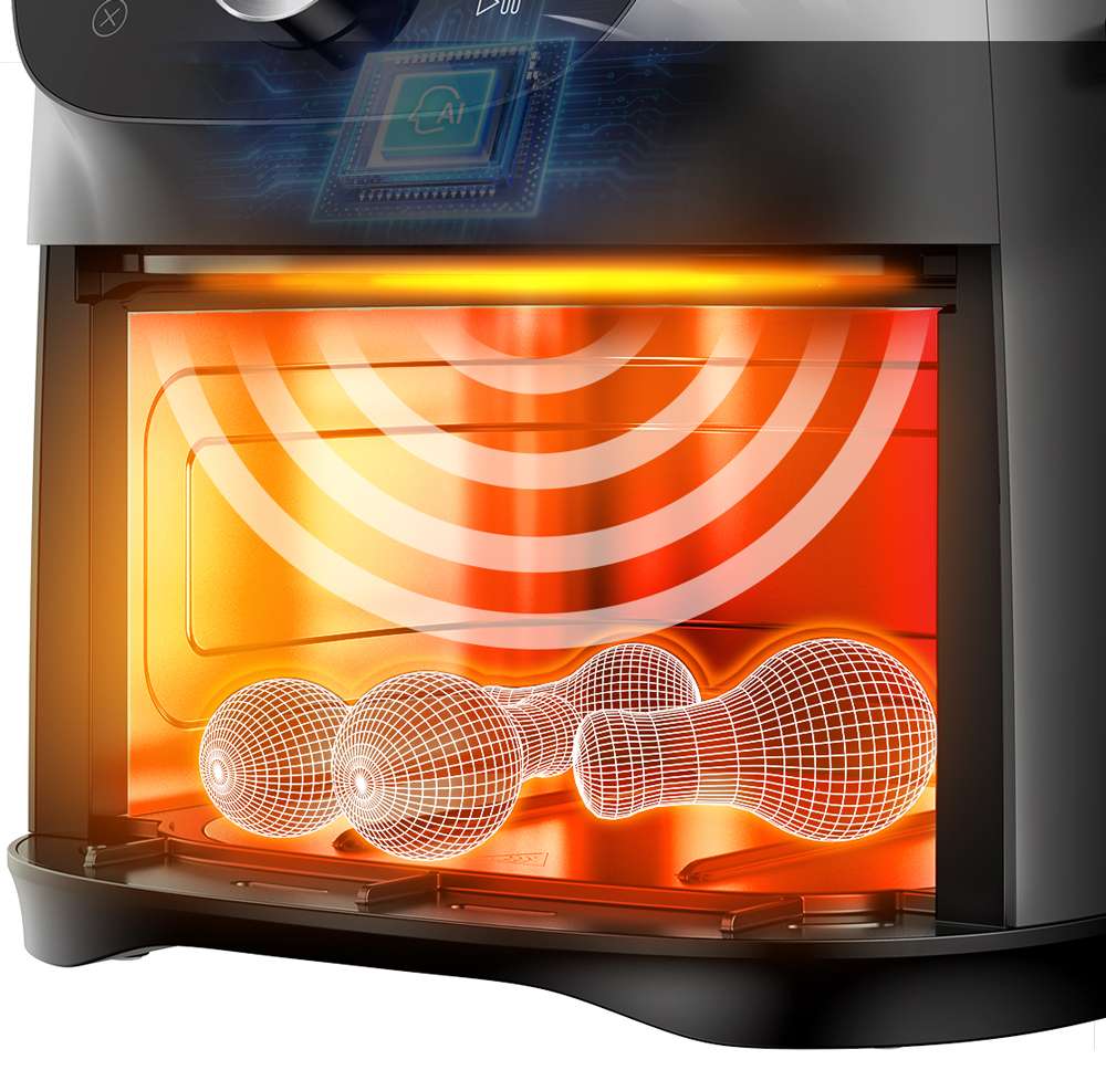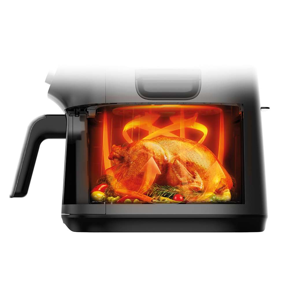 Sự kết hợp giữa bộ gia nhiệt hiệu suất cao, động cơ đối lưu mạnh và khoang lò thiết kế tối ưu tạo ra luồng khí siêu nhiệt “cơn lốc xoáy” giúp thực phẩm chín đều từ trong ra ngoài. Lớp mỡ thừa tan chảy và chảy xuống khay tách dầu, giảm dầu mỡ nhưng vẫn giữ được độ ẩm và hương vị thơm ngon.