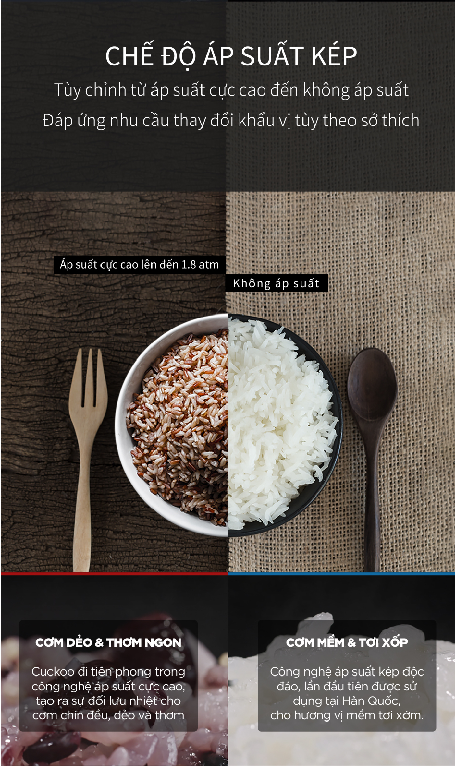 Nồi cơm áp suất điện tử Cuckoo 1.8 lít CRP-RT1008F sở hữu công nghệ áp suất kép Twin Pressure. Với tính năng này, cho phép tích hợp hai chế độ nấu hoàn toàn khác biệt là có áp suất và không có áp suất. Đây là công nghệ độc quyền được phát triển, kiểm nghiệm và hoàn thiện bởi đội ngũ chuyên gia R&D Hàn Quốc. Cho phép 2 chế độ: