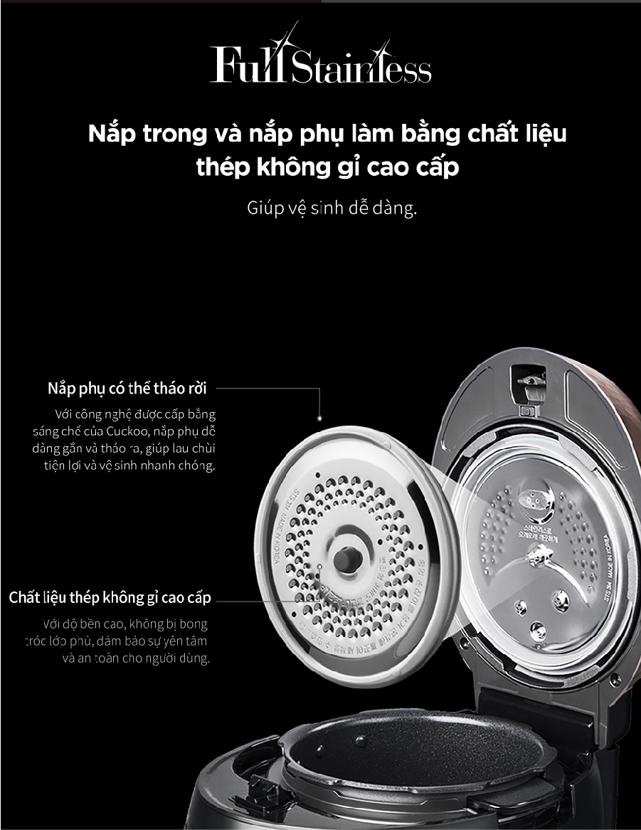 Nắp trong và nắp phụ của nồi cơm điện tử này được bao phủ bởi lớp thép không gỉ cao cấp, chịu được nhiệt độ và áp suất cao.