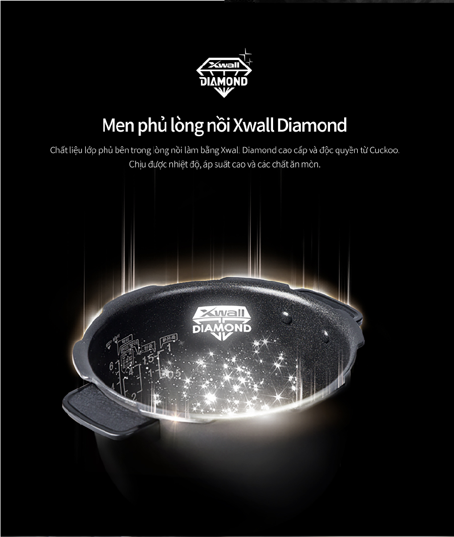 Chất liệu lớp phủ bên trong và ngoài lòng nồi làm bằng men độc quyền Xwall Diamond cao cấp. Chịu được nhiệt độ cao, áp suất cao, hay môi trường có tính ăn mòn nhưng làm cho hạt cơm chín đều mang đến hương vị cơm thơm ngon khác biệt.