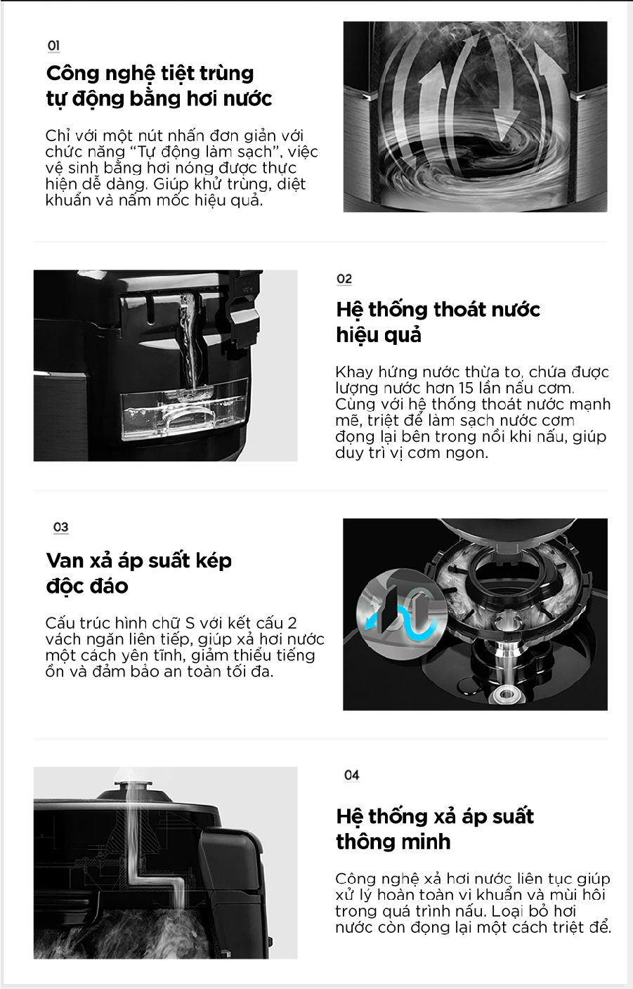 - Tự động làm sạch và khử khuẩn, cài đặt thời gian nấu
