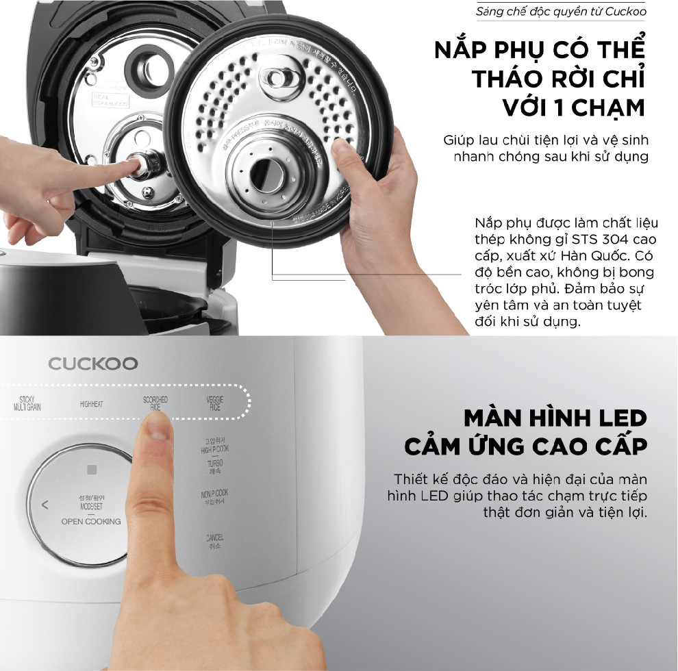Sáng chế độc quyền từ nhà Cuckoo khi nắp phụ có thể tháo rời dễ dàng chỉ với 1 nút chạm giúp lau chùi, vệ sinh nhanh chóng sau khi sử dụng. Nắp phụ của nồi được làm từ chất liệu STS 304 cao cấp bậc nhất từ xứ sở Kim Chi.
