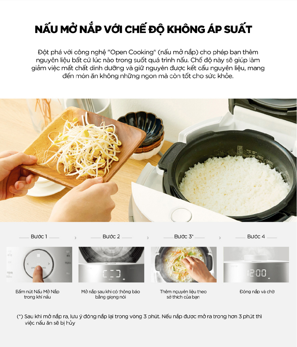 Đột phá, tiên phong với công nghệ "Open Cooking" (nấu mở nắp) cho phép bạn thêm nguyên liệu bất cứ lúc nào trong suốt quá trình nấu. Chế độ này sẽ giúp làm giảm việc mất chất dinh dưỡng và giữ nguyên kết cấu nguyên liệu, mang đến món ăn không những ngon mà còn tốt cho sức khỏe.