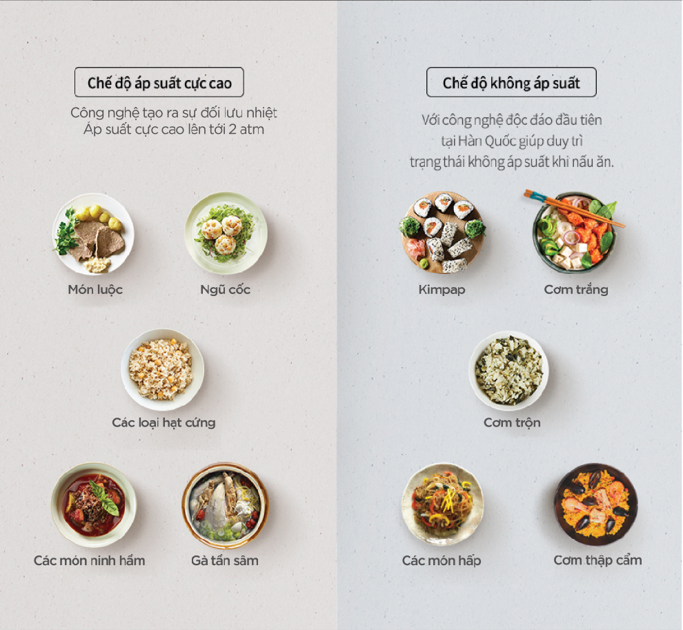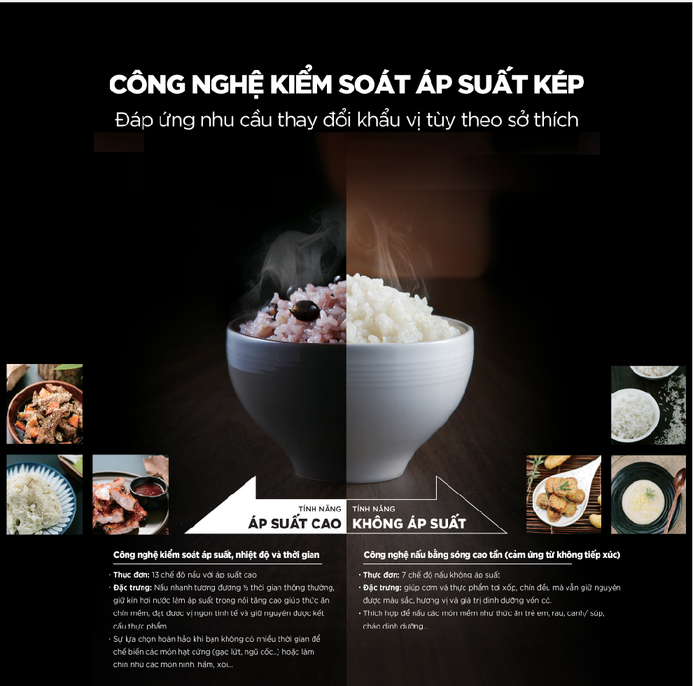 - Công nghệ Twin Pressure với 2 chế độ nấu áp suất và không áp suất (nấu mở nắp)