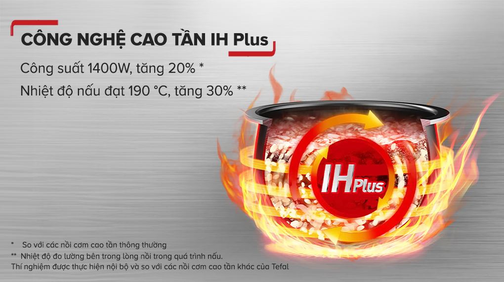 Sở hữu công suất 1400W, nồi cơm cao tần Tefal RK819868 mang đến khả năng nấu nhanh chóng và hiệu quả. Công nghệ cao tần IH Plus thế hệ mới giúp nhiệt độ nấu đạt đến 190°C, cao hơn 30% so với các dòng nồi thông thường. Cùng với đó, công nghệ làm nóng 3DMax với 3 mâm nhiệt (đáy, thân, nắp) tỏa nhiệt đồng đều, giúp cơm chín kỹ, dẻo thơm và giàu dưỡng chất.